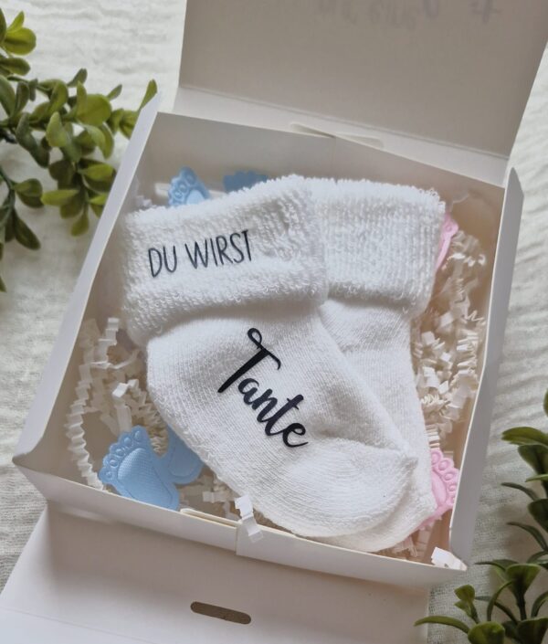 Mit meinen handveredelten Babysöckchen möchte ich dir helfen, dieses große Geheimnis auf die wohl süßeste Art und Weise zu lüften. Wenn die Box geöffnet wird und diese winzigen Söckchen zum Vorschein kommen, ist Gänsehaut garantiert. 💖🍼