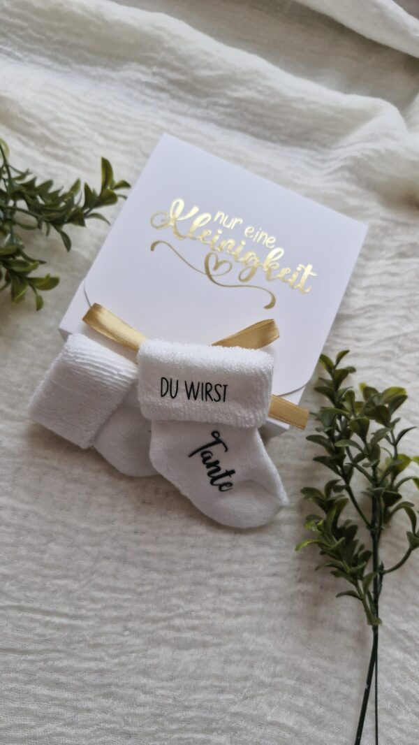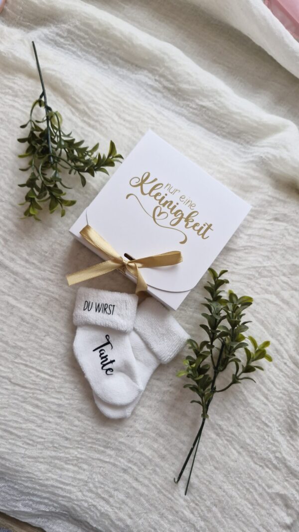 • Edle Verpackung inklusive: 📦 Die Söckchen kommen bereits fertig verschenkbar zu dir. Ich bette sie in eine hochwertige weiße Box mit dem goldenen Aufdruck „Nur eine Kleinigkeit“ und verziere alles mit einer eleganten Goldschleife.