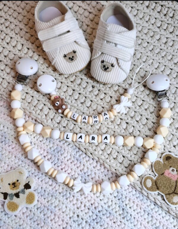 Ich habe dieses zeitlose Doppel-Set (Kinderwagen- und Schnullerkette) für Babys entworfen, die sanfte Geborgenheit lieben.