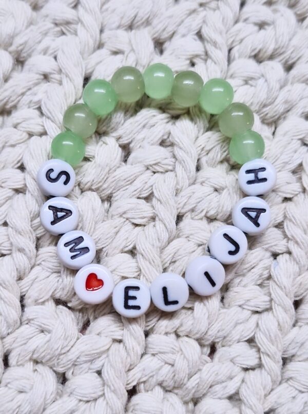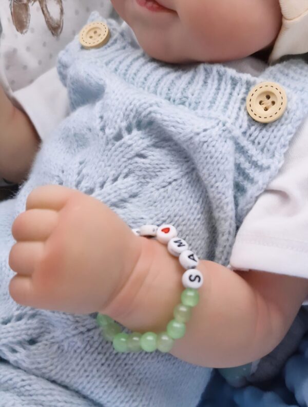 Diese supersüßen Babyarmbänder bestehen aus einem elastischen Schmuckband, Glasperlen und Buchstabenperlen aus Kunstoff.