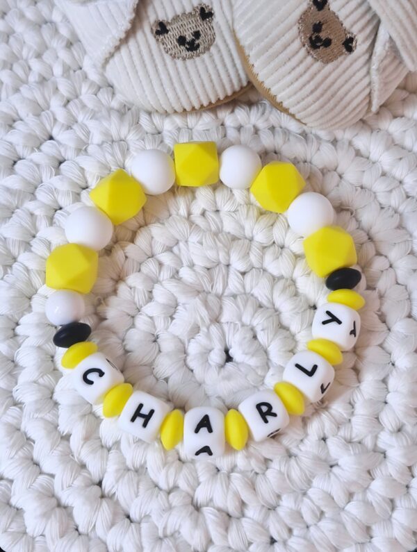 Geometrisches Design: 🖐️ Bei diesem Modell stehen die Formen im Fokus! Die markanten gelben Hexagon-Perlen wechseln sich mit sanften weißen Rundperlen ab. Das bietet dem Baby eine spannende haptische Abwechslung zum Tasten und Fühlen.