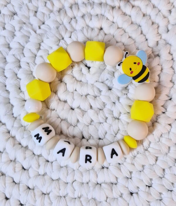 Unser handgefertigter Greifring für MARA bringt die Sonne direkt zu euch nach Hause! Mit seinem leuchtenden Gelb und dem niedlichen Bienen-Motiv ist er der perfekte Gute-Laune-Garant für dein Baby. ☀️💛